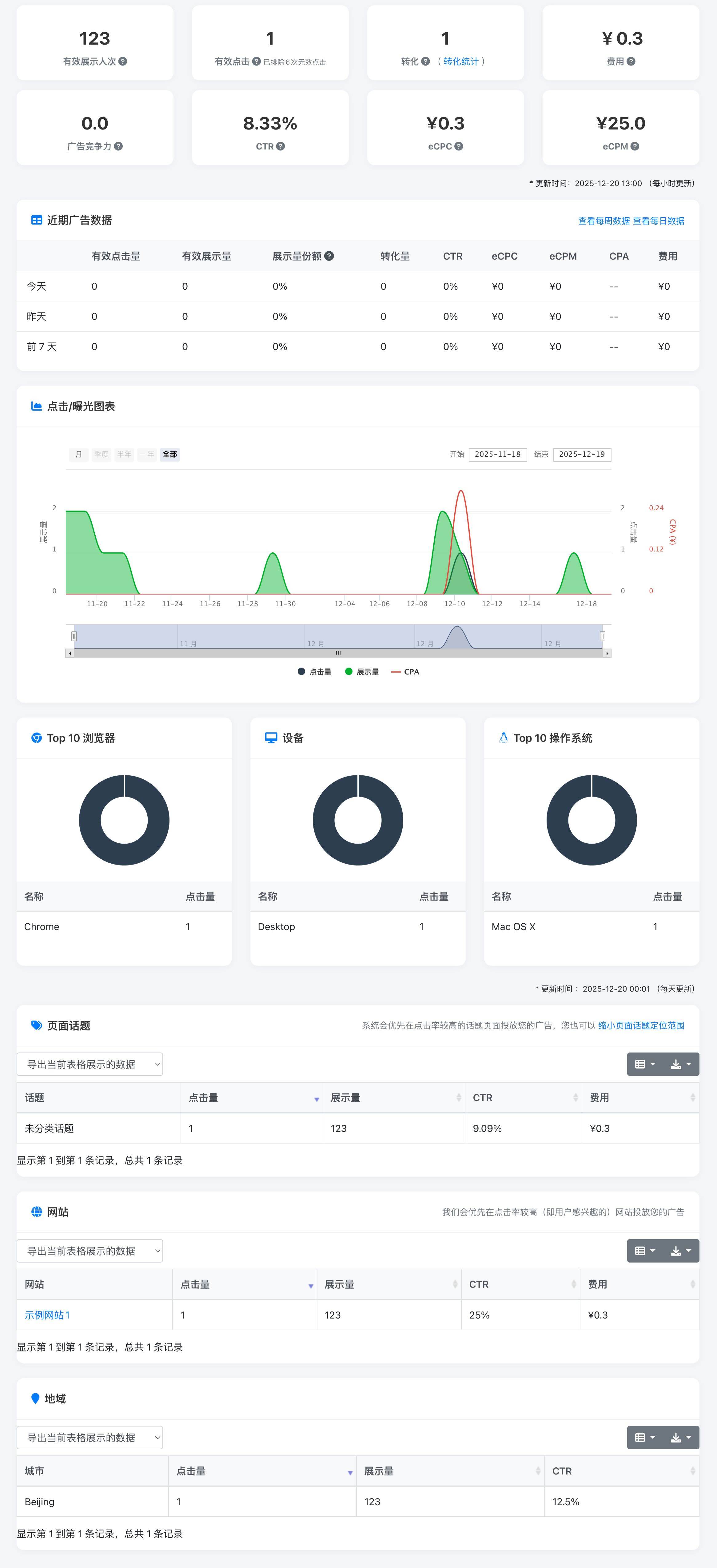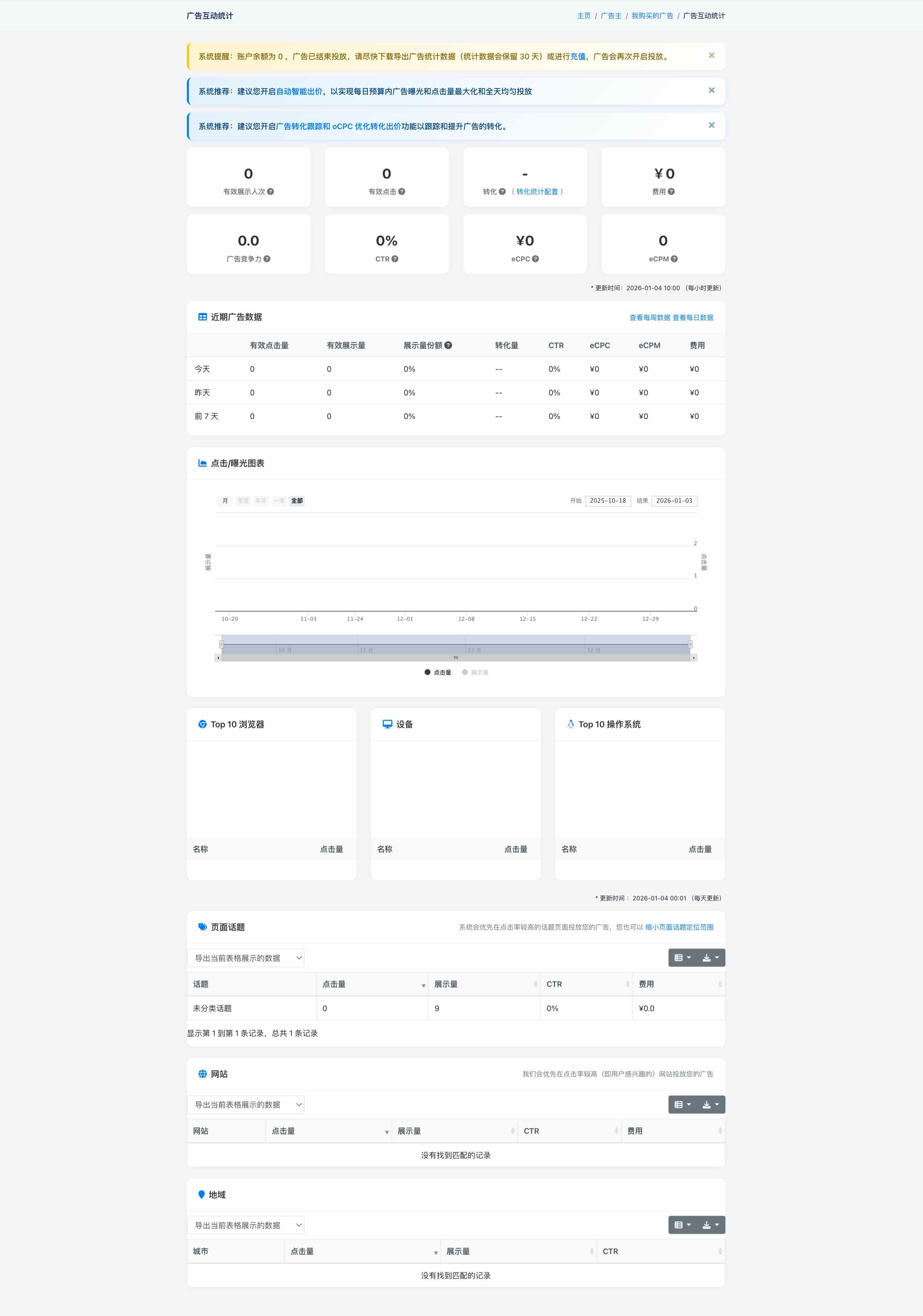 创建广告后,您可以点击进入管理中心,在投广告,点击查看广告互动统计按钮,查阅广告互动数据,如实例图: