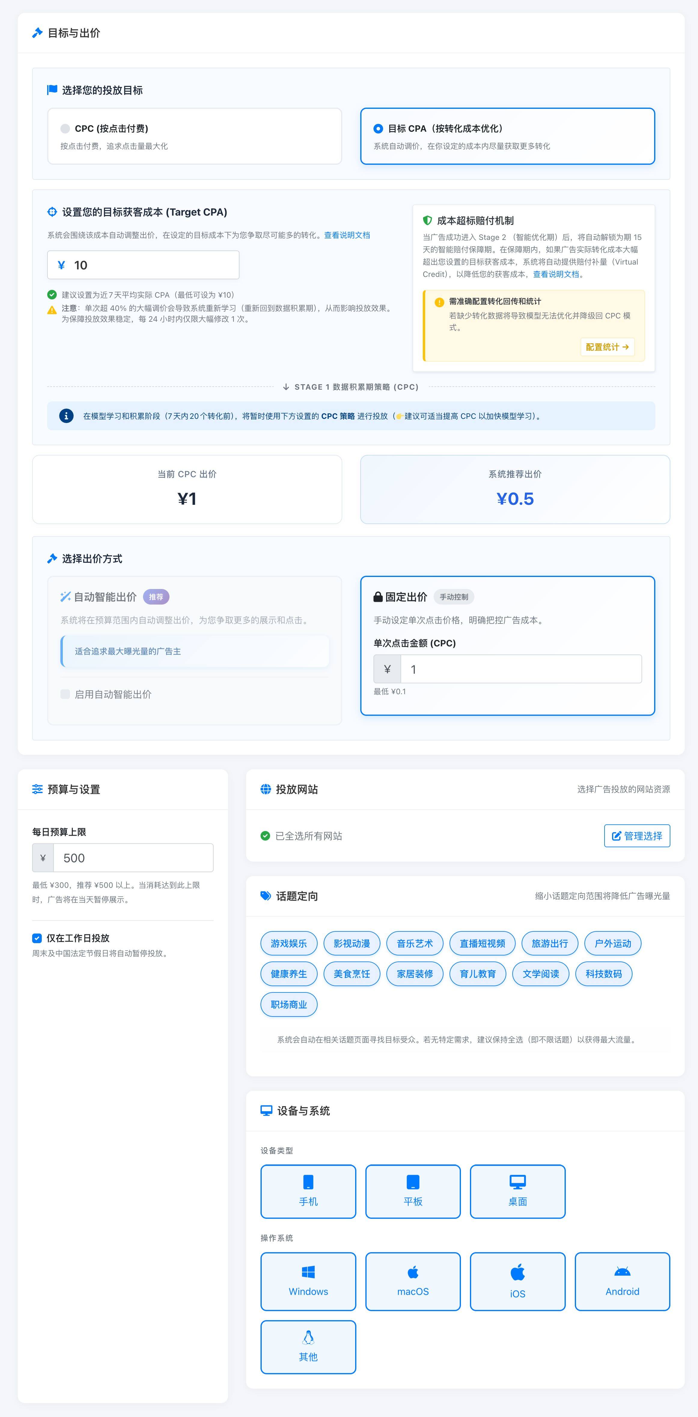 AdWork 为广告主提供了便捷的自助式 SaaS 服务,以便您快捷地投放广告。首先,您需要 开通广告主账户,一个公司主体仅可创建一个账户,目前每个账户最多可以同时投放 10 个广告(不包括已结束的广告)。在下单购买广告之前,您需要先根据 账户充值页面 的说明提示为您的账户余额进行充值,下单购买广告后每次点击从您的账户余额进行扣款(当账户余额为 0 时广告将自动暂停投放)。