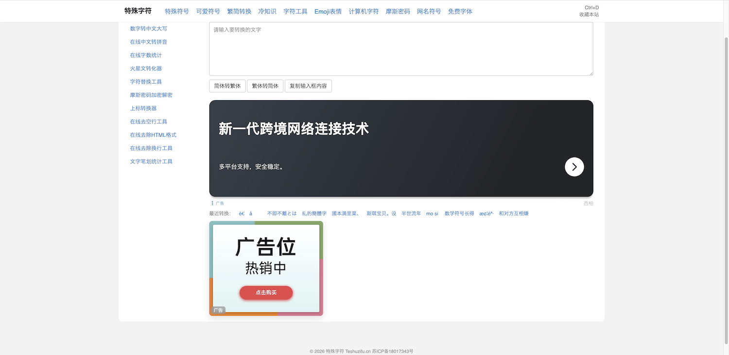提供特殊字符快速查询和复制工具,以及跟字符相关的转换工具、翻译工具、查询工具等。